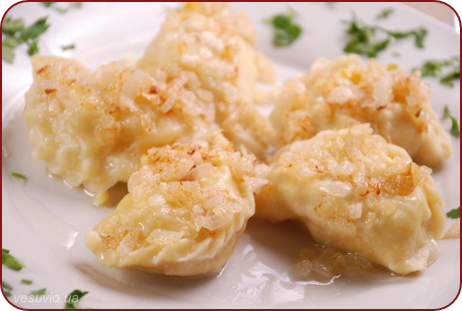 Traditional Ukrainian varenyky (Perogies), filled with potatoes, served with fried onion in sunflower oil.